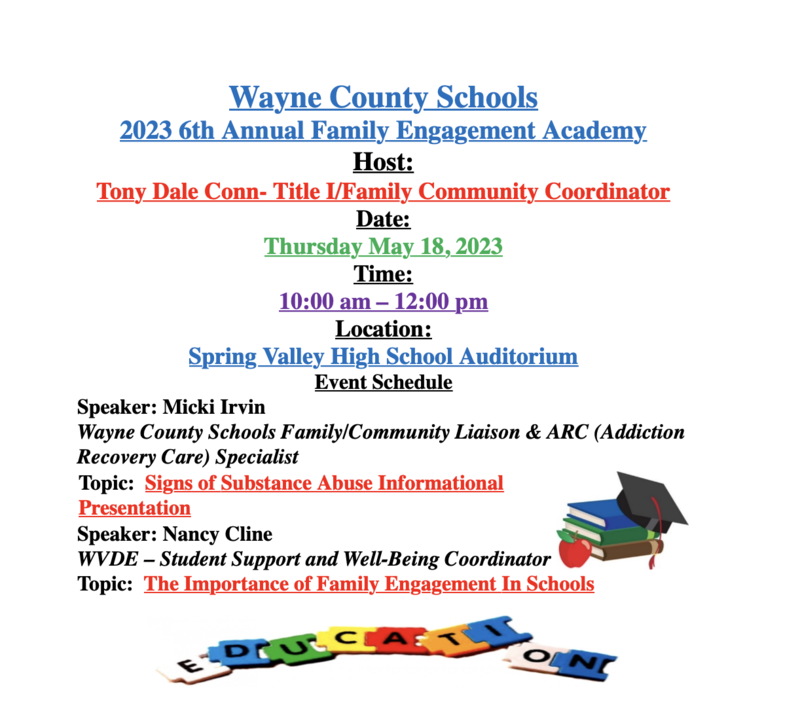 The 6th Annual Wayne County Schools (WCS) Family Engagement Academy is taking place on May 18th from 10:00 am to 12:00 pm at Spring Valley High School. The flyer at the bottom of this post has the complete list of events and speakers. This year, our speakers are covering The Signs of Substance Abuse and The Importance of Family Engagement. WCS encourages all families with a student(s) in WCS to attend this informational event.