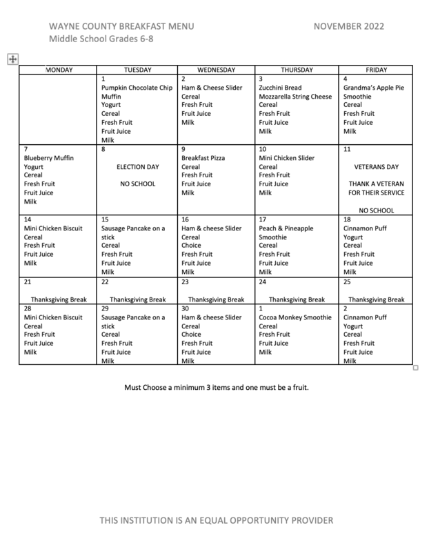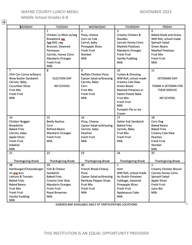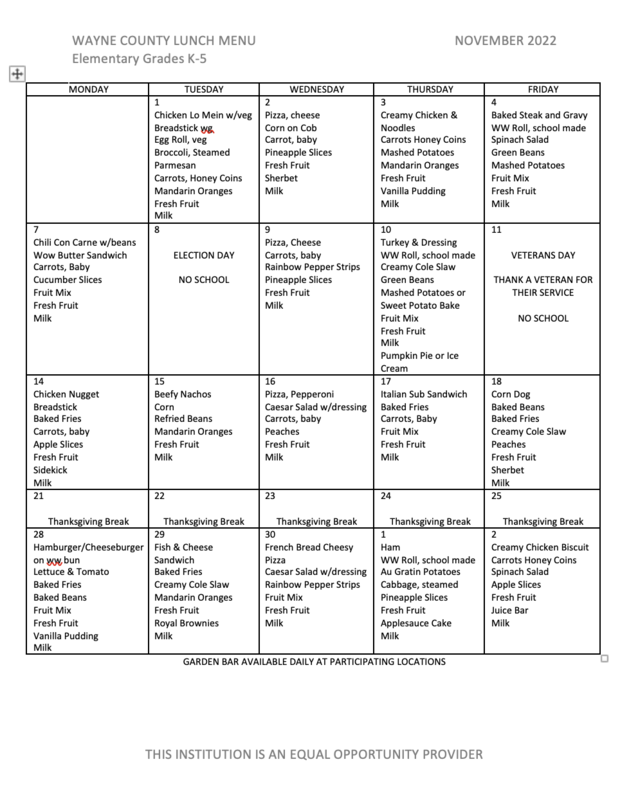 Below are the breakfast and lunch menus for November. They are in the following order: Elementary, Middle School, High School, and SVHS Fast Line.