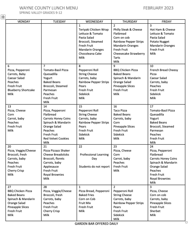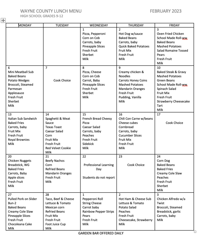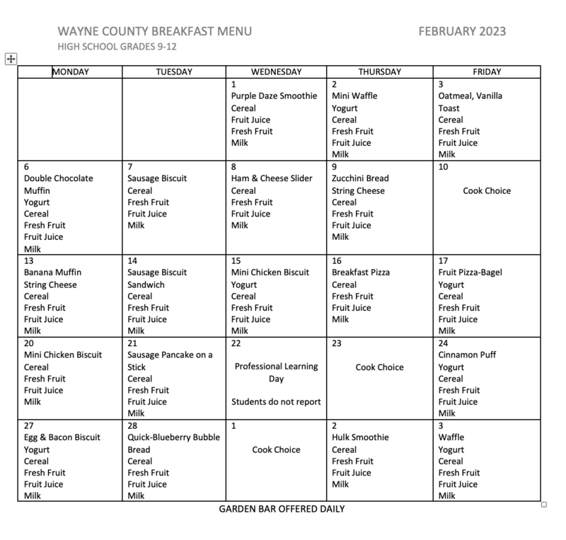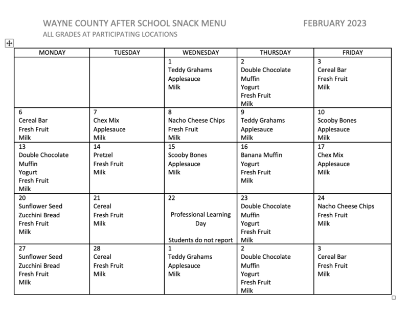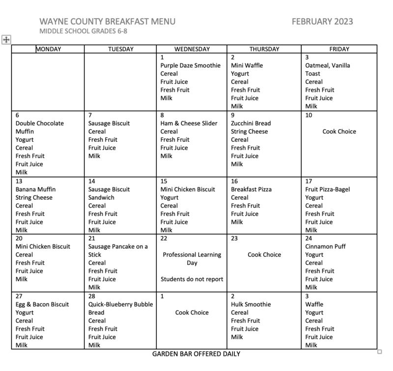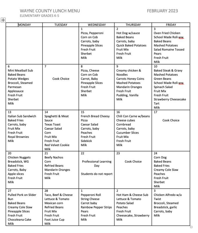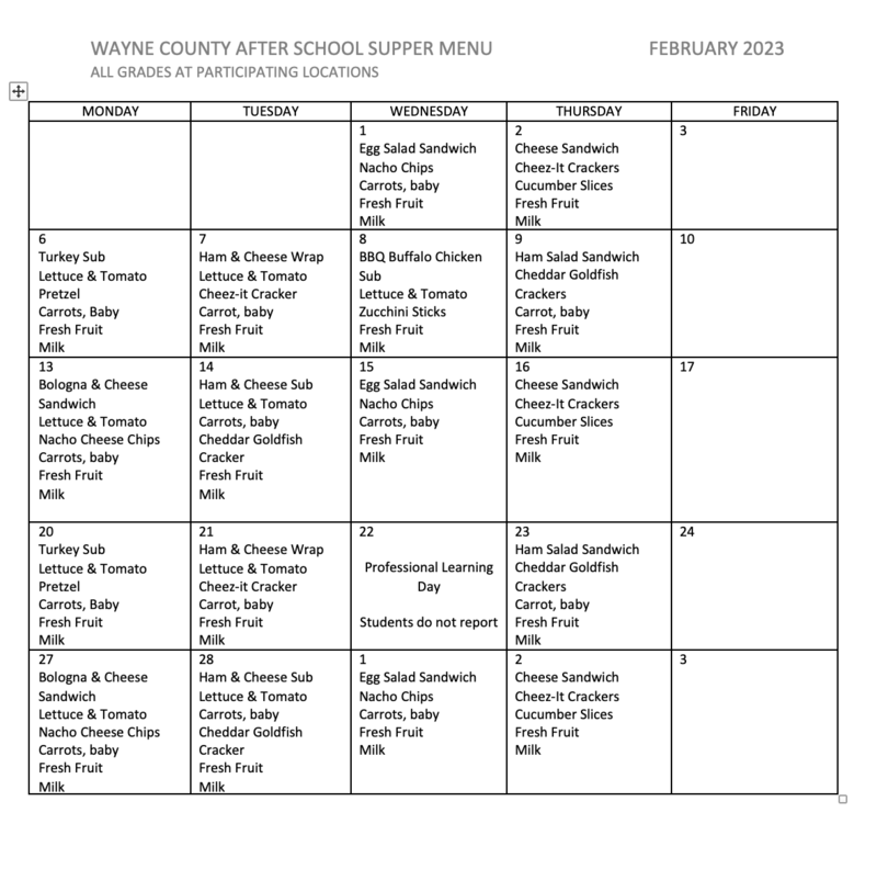 Below are the breakfast, lunch, after care snack, and aftercare dinner menus for February 2023. The menus start with elementary breakfast and go in order from there. The last menu is the aftercare supper.